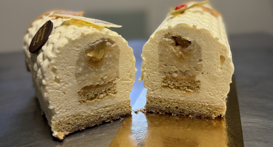 Une bûche qui allie la douceur de la pomme et le souvenir d’enfance du riz au lait.